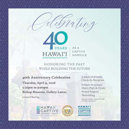 2026 marks a significant milestone — 40 years of Hawaii as a captive insurance domicile. To honor this milestone, the Hawaii Captive Insurance Council and the State of Hawaii Insurance Division are planning a 40th Anniversary Celebration on: